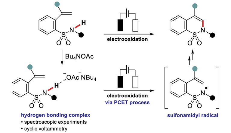 水素結合複合体の形成とプロトン共役電子移動によりスルホンアミジルラジカルが効率良く発生することを見出し、それを利用してスルタムを合成した論文です。