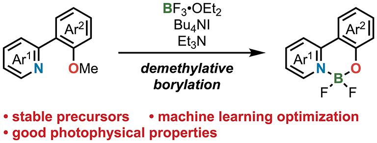 前川くん・間片くんの論文がOrg. Lett.誌に掲載されました!京都大学若宮研究室との共同研究です。BF3•OEt2, Bu4NI, Et3Nを絶妙な比率で加えるときれいに脱メチル化が進行してBF2化します。最適条件は機械学習(ベイズ最適化)でだしています。